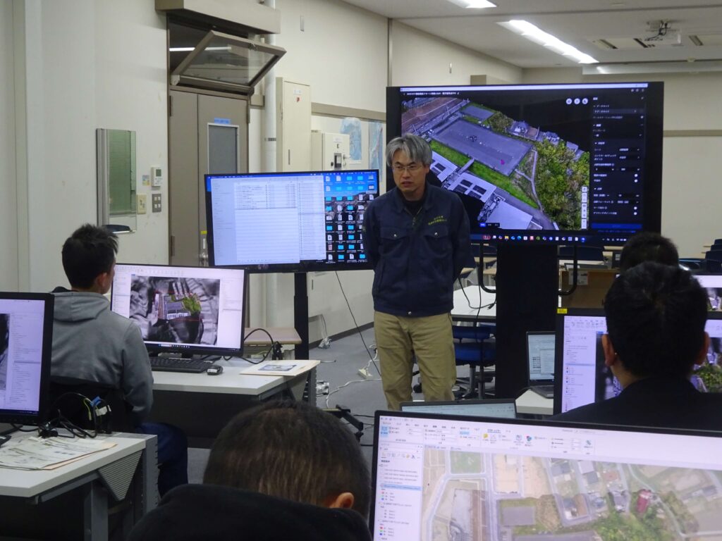 最初に事前視聴することになっていたオンデマンド配信の講義内容を振り返った後、GISソフトの起動と基本的操作、Shape fileのインポートとエクスポート、空間検索、ジオレファレンス、csvデータからポイントデータへのインポート、DEMデータのダウンロードや作成などについて演習を通して体験しました。最後には10月のドローン研修で得られた測量データからオルソ画像、DSM(Digital Surface Model)への変換された様子なども確認しました。
