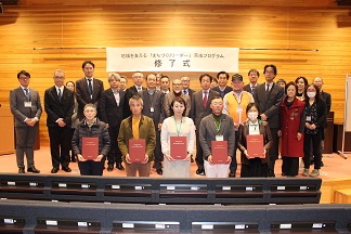 「令和7年度修了式」 2025年11月20日 11月15日(土)活動報告会に引き続いて、令和7年度の修了式が開催されました。 修了式は、岩手大学理工学部長の挨拶、理工学部長より受講生へ履修証明書の授与、まちづくりリーダー認定者紹介、そして校長の式辞と続きました。 半年にわたる学びを終えた受講生の皆様が、最後に集い、修了認定の喜びを分かち合い、そして今後の地域社会での取り組みについて思いを新たにする場になったことと思います。 地域のエコ・防災の向上とまちづくりに貢献されることを心より祈念申し上げます。